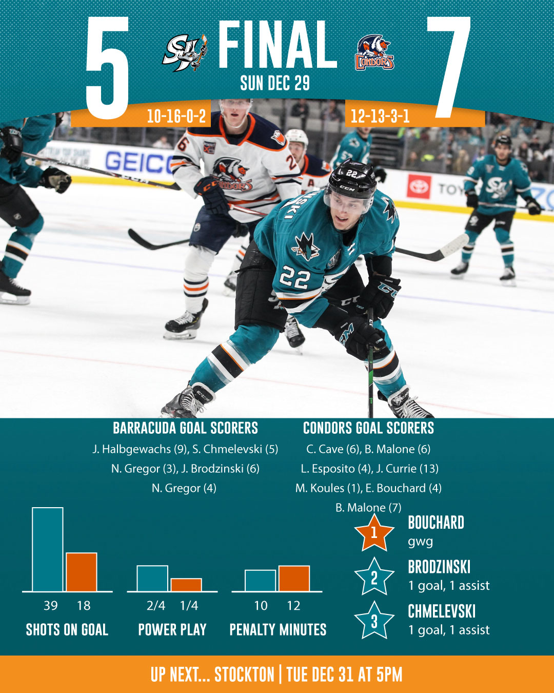 The San Jose Barracuda (10-16-0-2) welcomed the Bakersfield Condors (12-13-3-1) (Edmonton Oilers) inside the SAP Center on Sunday for the fourth annual Pucks and Paws game and could not fully recover from a 5-1 deficit, eventually falling 7-5 in their final home game of 2019.