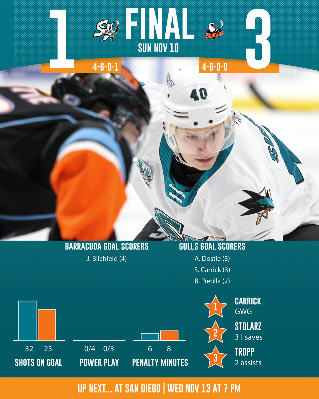 - The San Jose Barracuda (4-6-0-1) went down 3-0 in the second period against the San Diego Gulls (4-6-0-0) (Anaheim Ducks) on Sunday evening and could not recover, eventually falling 3-1 inside of SAP Center at San Jose