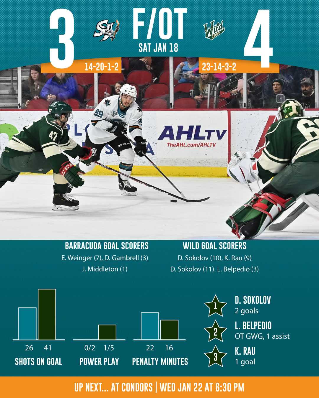 The San Jose Barracuda (14-20-1-2) took an early lead on Saturday at the Wells Fargo Arena but the Iowa Wild (22-14-3-2) (Minnesota Wild) would storm back before earning the win in overtime, 4-3.