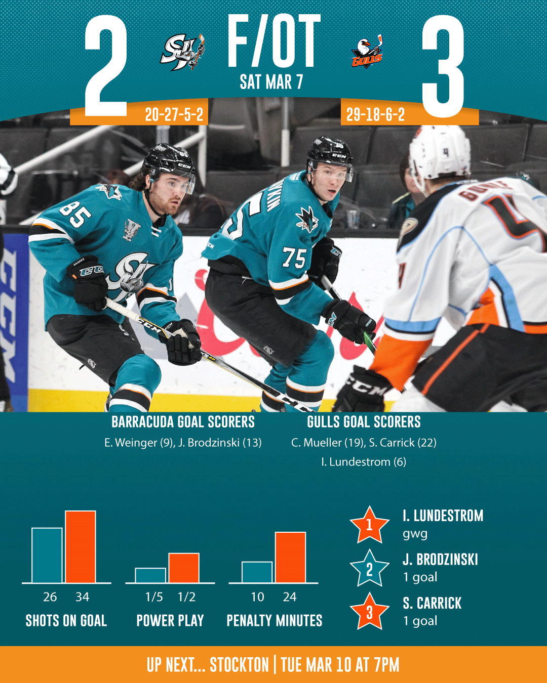 - Saturday's game was the third-straight between the Barracuda and Gulls that needed overtime to decide it
