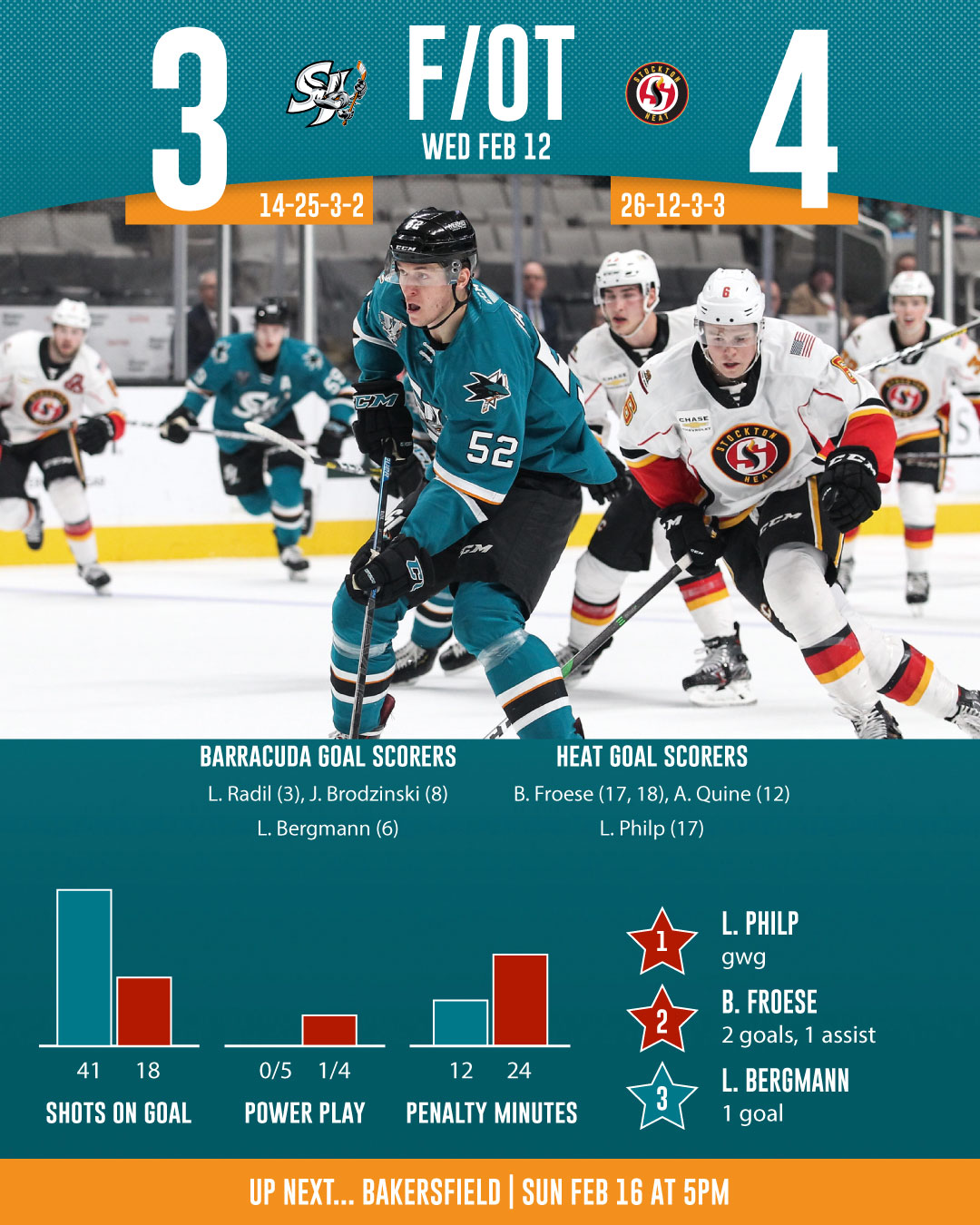 The San Jose Barracuda (14-25-3-2) returned to the SAP Center on Wednesday and surrendered a late lead to the Stockton Heat (26-12-3-3) (Calgary Flames) in an eventual 4-3 overtime loss.