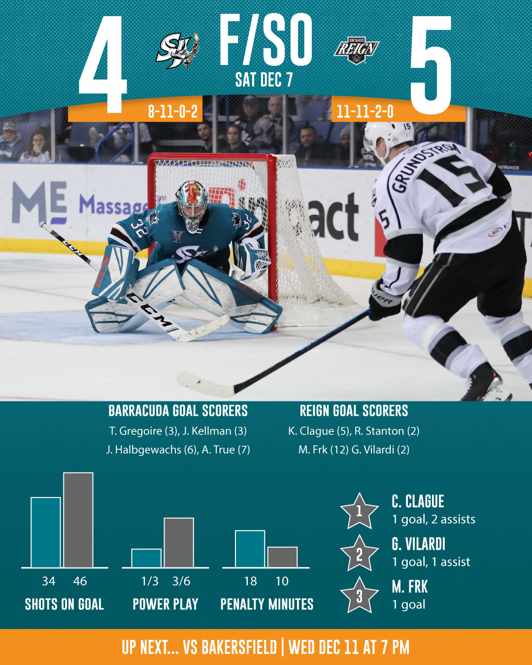 The San Jose Barracuda (8-11-0-2) scored the first three goals on Saturday night at the Toyota Arena, but the Ontario Reign (11-11-2-0) (LA Kings) stormed back before winning 5-4 in a shootout.