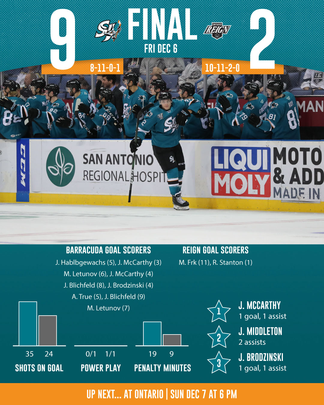The San Jose Barracuda (8-11-0-1) picked up their first win in three tries against the Ontario Reign (10-11-2-0) (LA Kings) on Friday night at the Toyota Arena as they matched a franchise-high with nine goals in a 9-2 win.