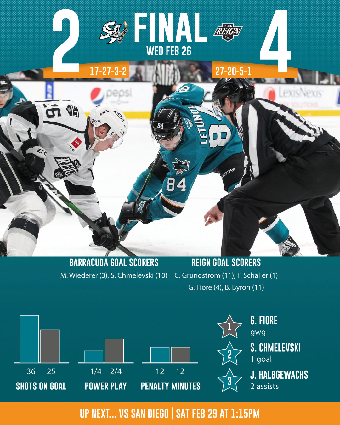 The San Jose Barracuda (17-27-3-2) opened up a six-game home stand against the Ontario Reign (27-20-5-1) (Los Angeles Kings) at the SAP Center on Wednesday night, and dropped the game to their Pacific-Division rivals, 4-2.