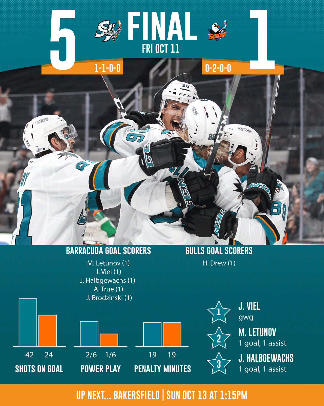 - The San Jose Barracuda (0-1-0-0) returned to the SAP Center on Friday night for their 2019-20 home opener against the San Diego Gulls (Anaheim Ducks) (0-2-0-0) and scored three times in the first en-route to a 5-1 win