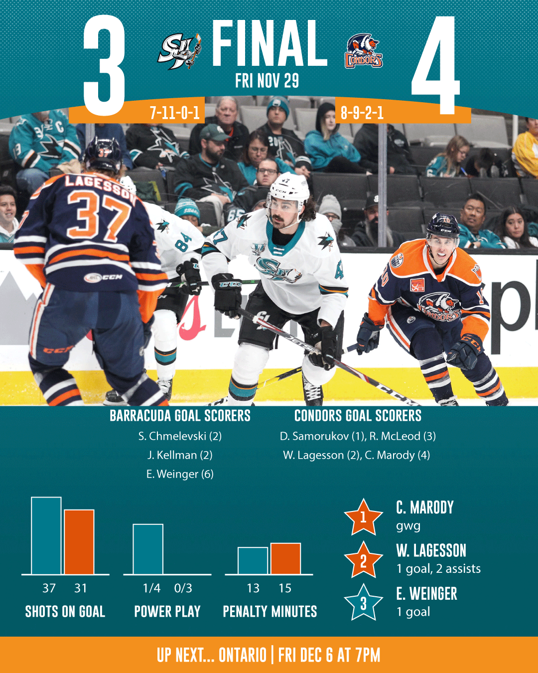 The San Jose Barracuda (7-11-0-1) returned home to the SAP Center on Friday riding a two-game winning streak but weren't able to stave off the Bakersfield Condors (8-9-2-1) (Edmonton Oilers), falling 4-3 in the second game of #HockeyDayinSanJose doubleheader
