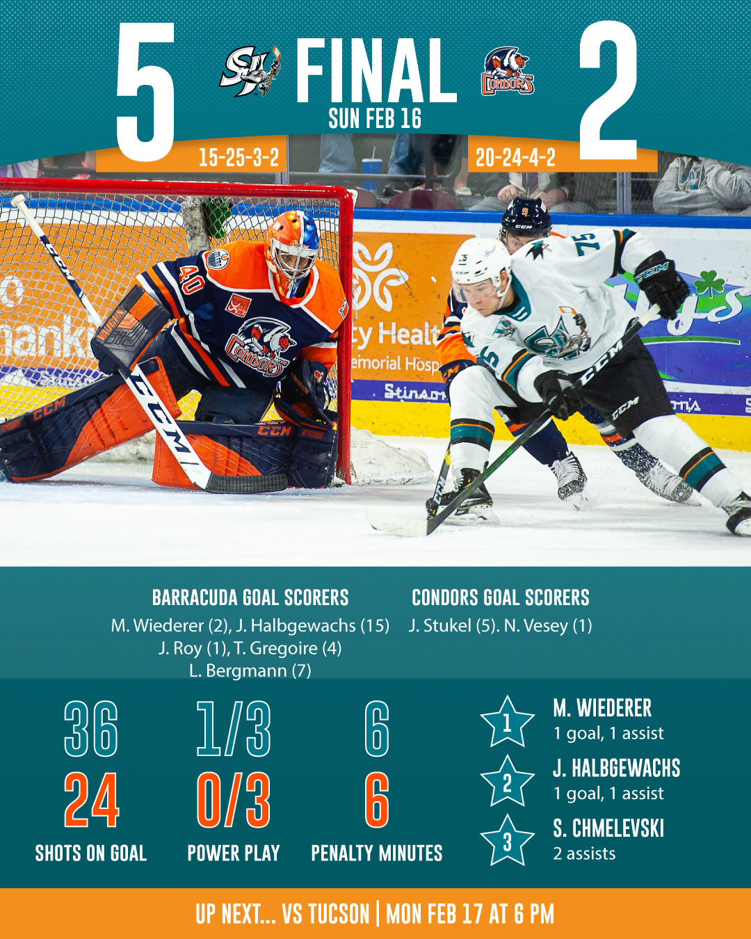 The San Jose Barracuda (15-25-3-2) snapped its eight-game losing skid on Sunday night at the Mechanics Bank Arena with a 5-2 win over the Bakersfield Condors (20-24-4-2) (Edmonton Oilers). The victory also extended the team's point streak to three games (1-0-2-0).