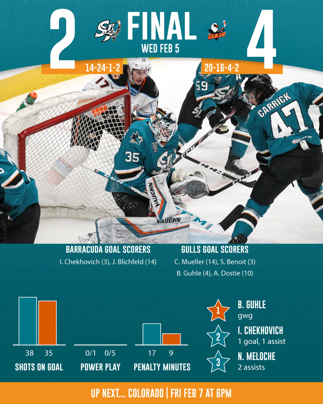 The San Jose Barracuda (14-24-1-2) returned to the SAP Center on Wednesday night to take on the San Diego Gulls (20-16-3-2) (Anaheim Ducks) for the second-straight game, and fell to their Pacific Division rival 4-2.