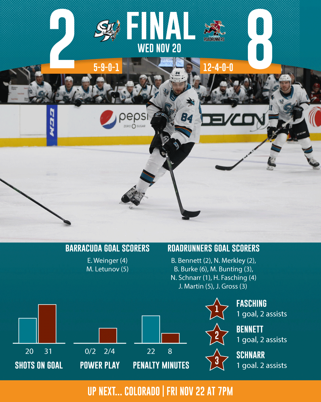 - The San Jose Barracuda (5-9-0-1) continued their four-game home-stand on Wednesday at the SAP Center against the Tucson Roadrunners (12-4-0-0) (Arizona Coyotes) and despite scoring just a minute and nine seconds into the game the Barracuda would fall 8-2