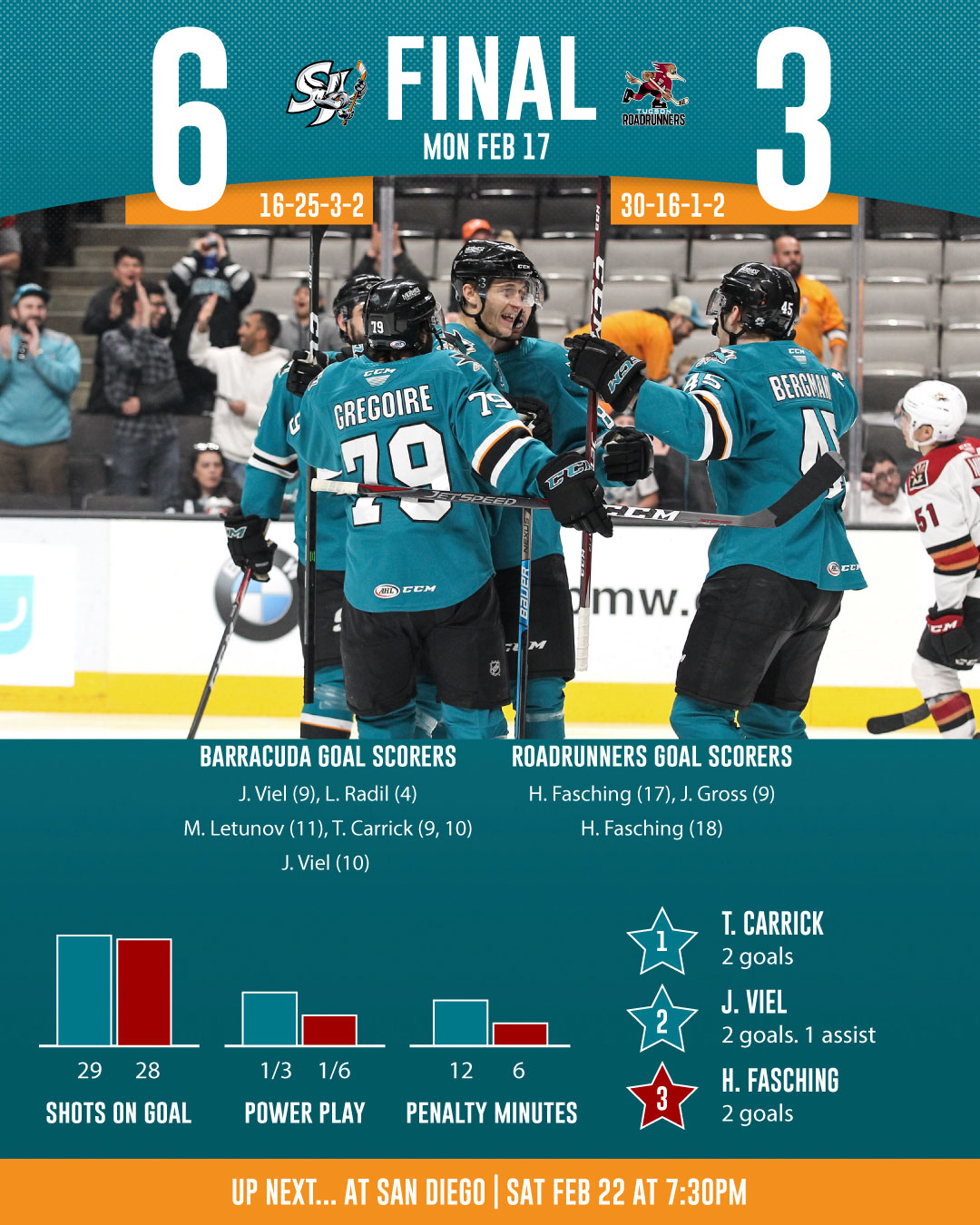The San Jose Barracuda (16-25-3-2) took on the Tucson Roadrunners (30-16-1-2) (Arizona Coyotes) in the second leg of a #HockeyDayinSanJose double-header at the SAP Center on Monday, and got points from ten different skaters en-route to a 6-3 victory.