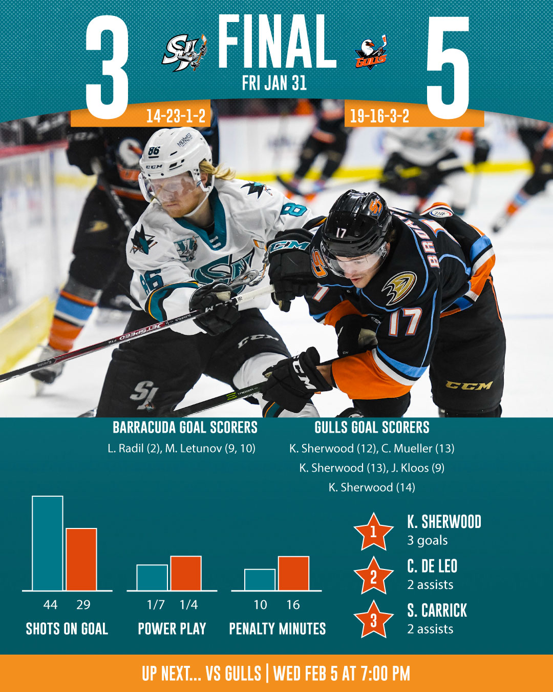 - Kiefer Sherwood (12, 13, 14) became the first player to score two shorthanded goals against the Barracuda in a game and became the fourth opposing player this season to score three times against the Barracuda