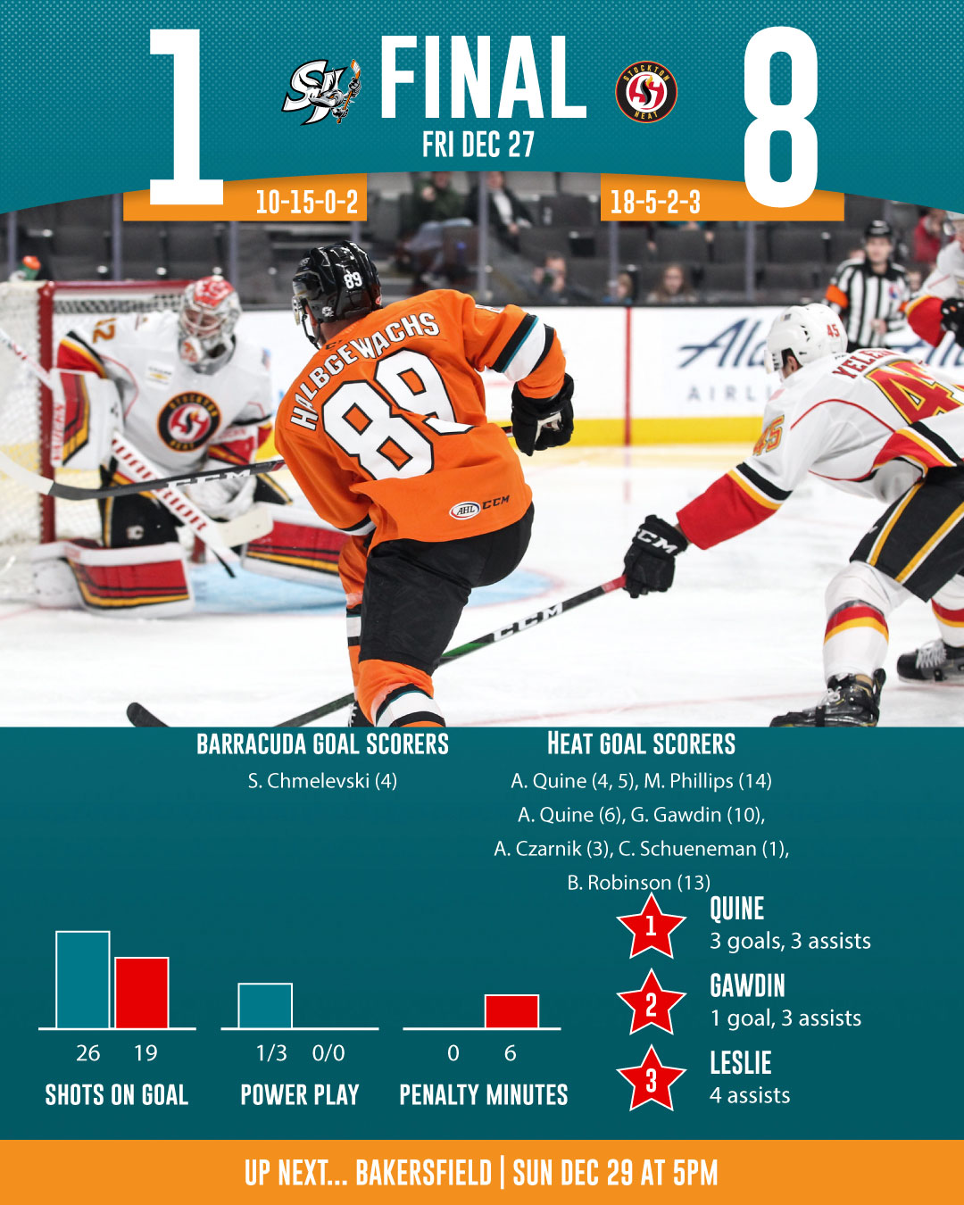 - Alan Quine (4, 5, 6) netted a hat-trick and added three assists in the win for Stockton