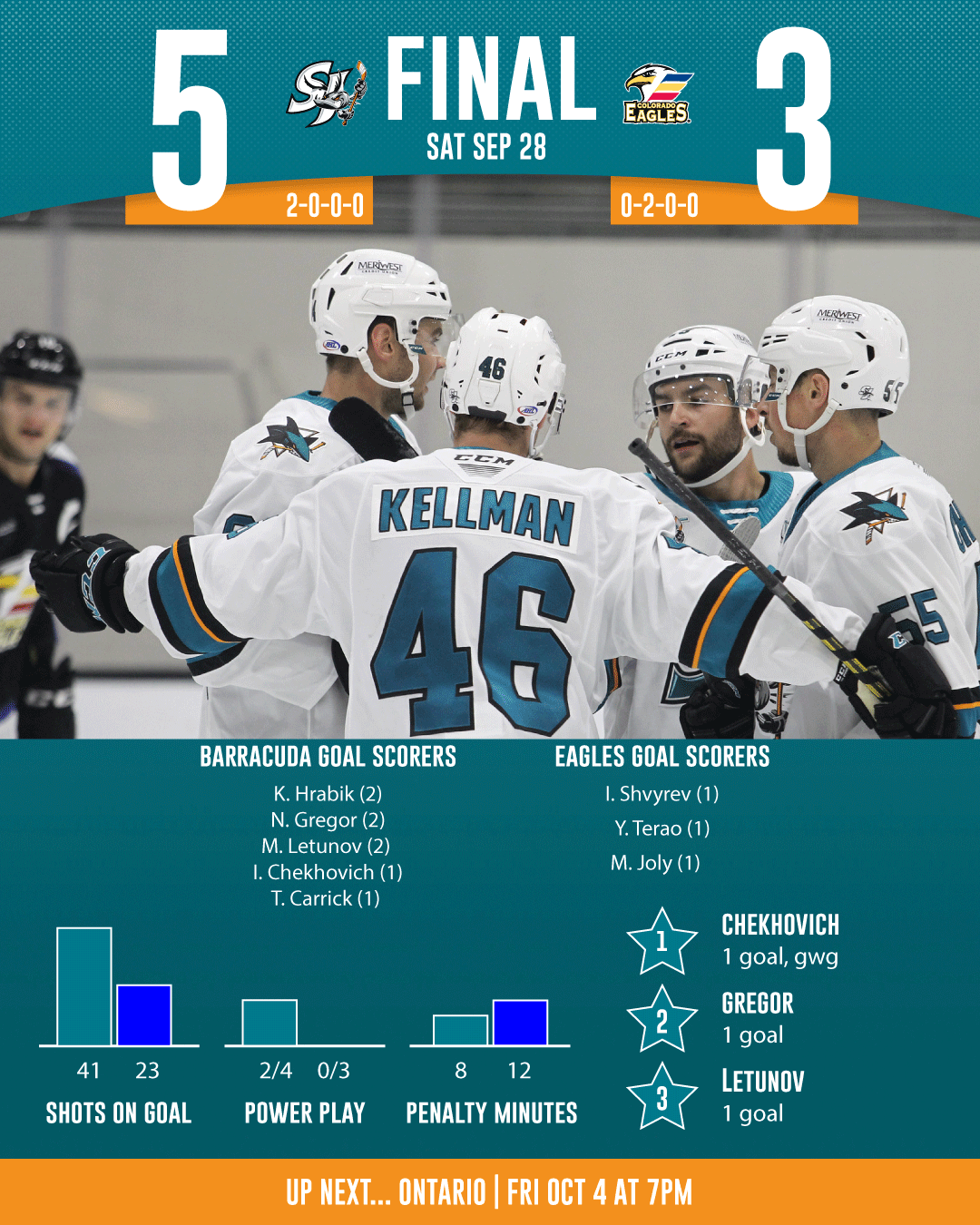- San Jose (2-0-0-0) wrapped up the preseason against the Colorado Eagles (0-2-0-0) (Colorado Avalanche) on Saturday night at Solar4America Ice at San Jose. The Barracuda finished their preseason with a flawless record after beating the Colorado Eagles 5-3. The Barracuda's focus now shifts to opening night on Friday, October 4th in Ontario.