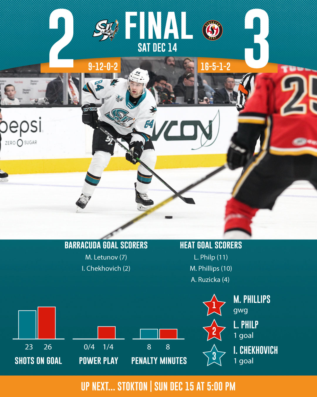 The San Jose Barracuda (9-12-0-2) welcomed the Stockton Heat (16-5-1-2) (Calgary Flames) to the SAP Center on Saturday afternoon in the first leg of a #HockeyDayinSanJose doubleheader, looking to extend their point streak to four games. The Barracuda were able to draw within a goal in the third after falling into a two-goal deficit but couldn't tie the score and eventually fell 3-2.