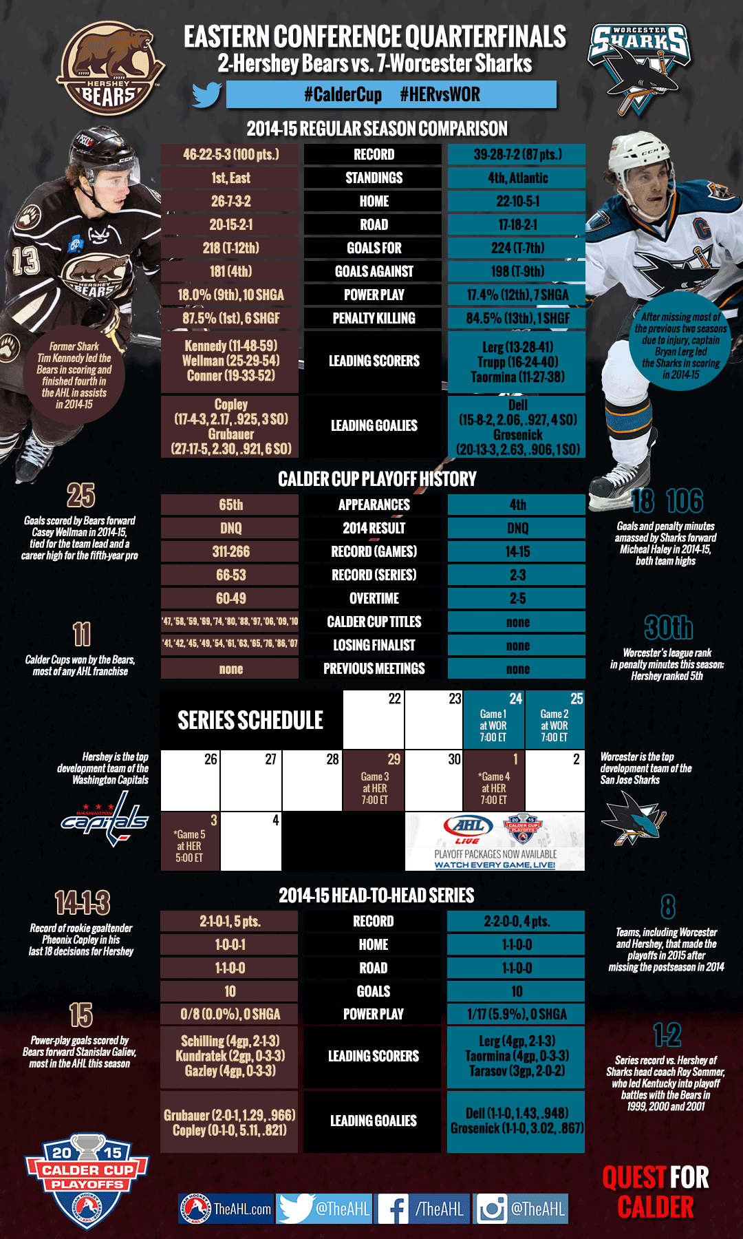 The 2014-15 regular season series between Worcester and Hershey was split between the two, with the Sharks going 2-2-0-0 including one shootout win.
